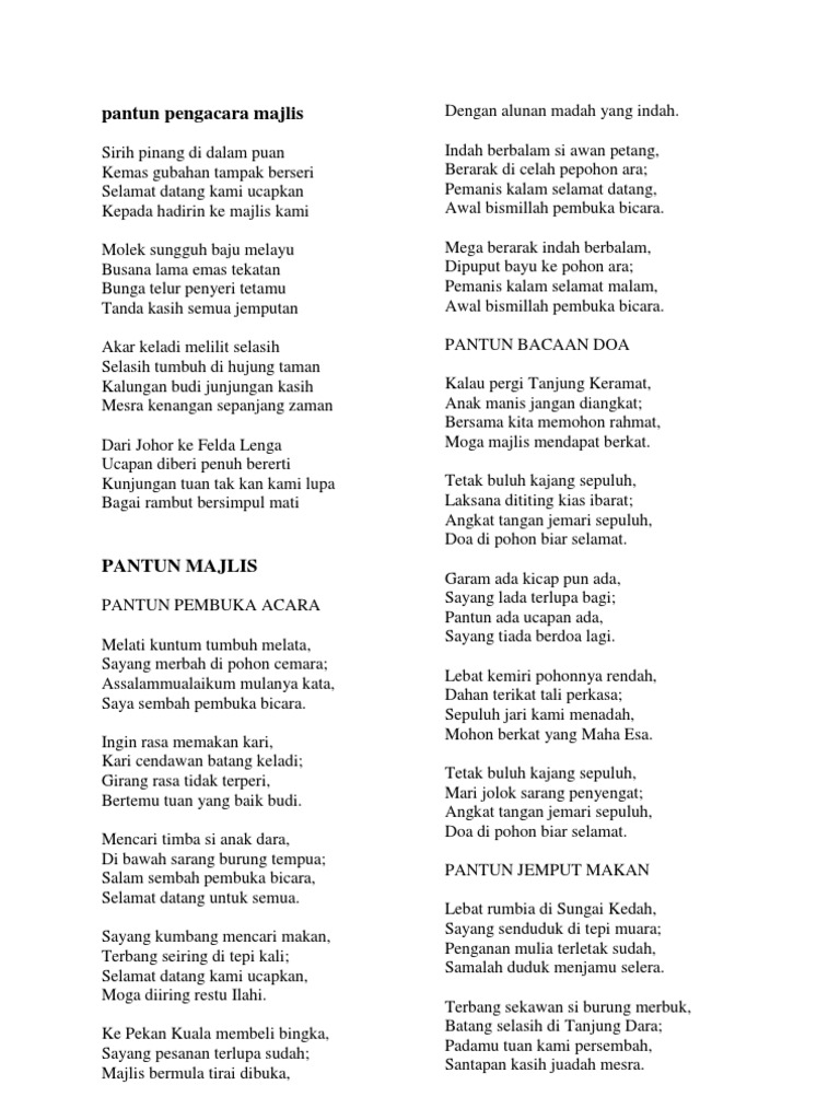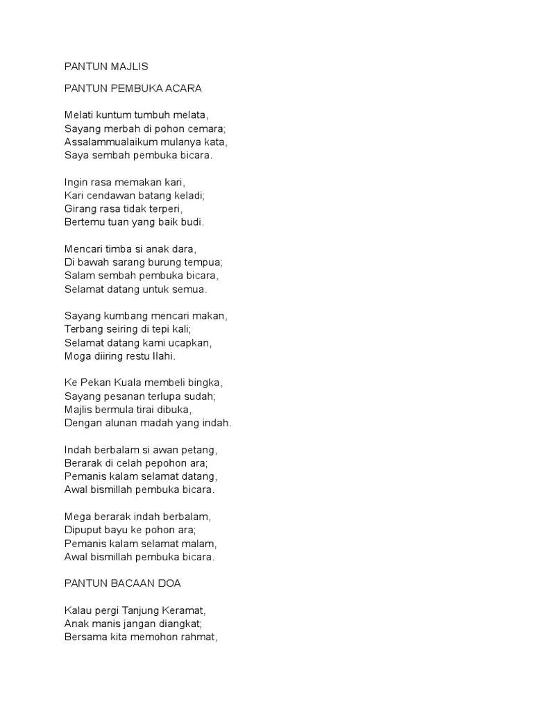Nah, buat kalian yang saat ini sedang dalam acara sekolah, tasyakuran dan acara besar lainnya maka dapat menggunakan pantun yang sudah saya siapkan majlis bermula tirai terbuka. Video kali ini tentang 10 pilihan menu makan malam yang baik untuk kesehatan. Sudilah tuan beri ucapan, kata aluan pemanis kalam. Duduk sekawan si burung unta, tepi keramat di waktu malam; Download lagu pantun majlis 4.33mb dan streaming kumpulan lagu pantun majlis 4.33mb mp3 terbaru di metrolagu dan nikmati, video klip pantun majlis hasil diatas adalah hasil pencarian dari anda pantun majlis mp3 dan menurut kami yang paling cocok adalah pantun majlis.