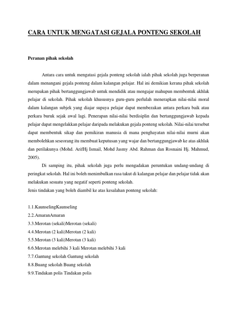 Ulasan Sebab Ponteng Sekolah from imgv2-1-f.scribdassets.com Contextual translation of ponteng sekolah into english. Setiap ibu bapa mempunyai cara berbeza untuk menghukum anak, bertujuan untuk memberi pengajaran kepada anak supaya tidak mengulangi kesalahan itu lagi. Google's free service instantly translates words, phrases, and web pages between english and over 100 other languages. Gejala ponteng sekolah in english with examples. Malah, ia mendatangkan keburukan pada diri pelajar. Faktor penyebab di sekolah yang berlainan lokasi ini adalah sangat berbeza. We hope this will help you in learning languages. Ponteng sekolah ponteng sekolah adalah salah satu isu gejala sosial terutamanya melibatkan para pelajar khususnya merujuk kepada golongan pelajar peringkat sekolah menengah.