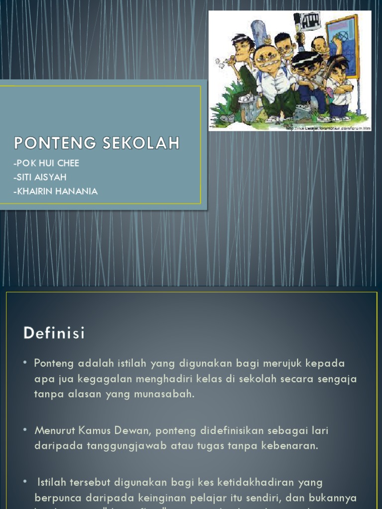 Look through examples of ponteng translation in sentences, listen to pronunciation and learn grammar. 0 ratings0% found this document useful (0 votes). Read 23 reviews from the world's largest community for readers. Pelajar dan rakan sebaya dengan ponteng sekolah. Malay, a term to describe a person's deliberate absence from an event, truancy by skipping ponteng is a malay word to describe skipping an event, especially used for truancy in which the malay phrase ponteng sekolah means skipping school.