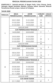 Kalendar 2020 senarai cuti umum cuti sekolah tahun 2020. Info tarikh mula dan kembali ke sekolah 2021 selepas cuti akhir tahun. Sekolah ditutup negeri kumpulan b sehingga: Datesheet rasmi untuk cuti sekolah 2020 malaysia telah diiktiraf oleh kementerian pelajaran. Sistem sekolah di malaysia bagi sekolah rendah mahupun sekolah menengah akan berakhir pada hujung tahun iaitu sekitar bulan november atau disember setiap tahun.