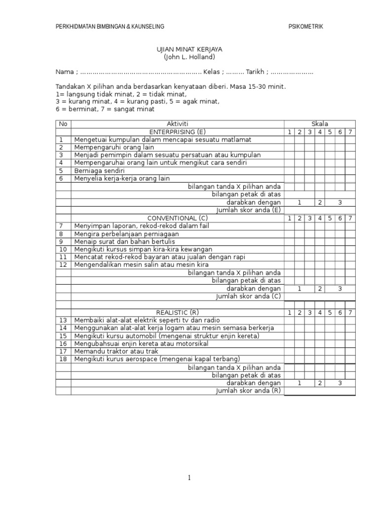 Inventori Kerjaya Holland from imgv2-1-f.scribdassets.com Dalam psikometrik terdapat ujian minat kerjaya (teori kerjaya holland) untuk mengukur minat kerjaya anda dan ciri2 personaliti anda.anda dalam kategori. indeks pembezaan diperoleh dgn menolak skor tertinggi dgn skor terendah dlm sesuatu ujian minat kerjaya. Ya, saya akan menjadi raja. Soal selidik minat kerjaya john l. Cenderung bekerja di luar bangunan contoh kerjaya Soal selidik minat kerjaya arahan : Ketahui dan ambillah ujian ini free online! 1= langsung tidak minat, 2 = tidak minat, 3 = kurang minat, 4 = kurang pasti, 5 = agak minat, 6 = berminat, 7 = sangat minat no 1 2 3 4 5 6.